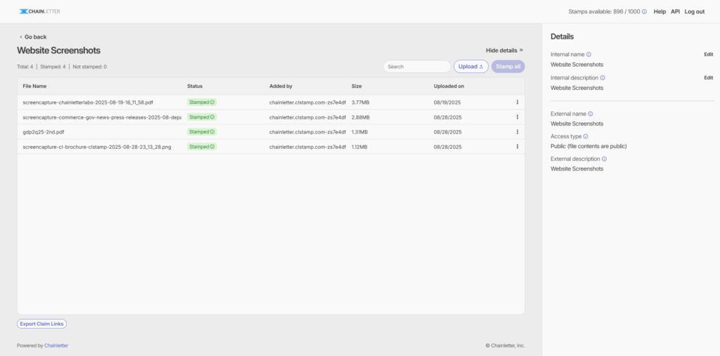 We put a lot of time into a feature set for file stamping we feel will be the most compatible with how people currently share information. We have handy links directly to block explorer websites, we allow for private files to be stamped but not posted online, we support files of any type or size. The list goes on. If you’re interested in stamping your own official records, documents, photos, or whatever, reach out!
